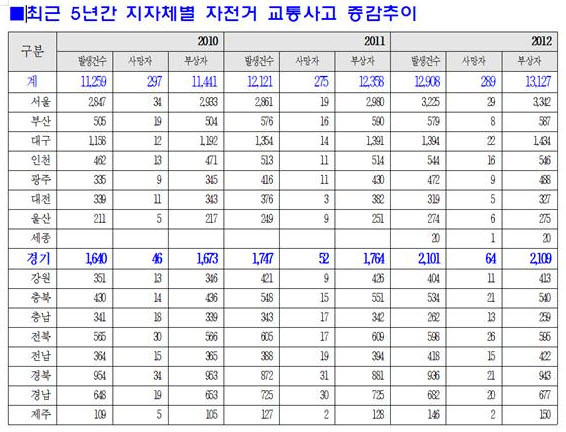 특히 경기도에서만 전국의 16.9%에 달하는 1만1202건의 자전거 교통사고가 발생해 275명(19.2%)이 목숨을 잃고 1만1360명(18.2%)의 부상자가 생겼다.