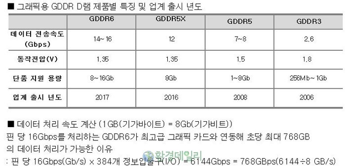 이 제품은 세계 최고 속도의 GDDR6(Graphics DDR6) 그래픽 D램으로 20나노급 8Gb(기가비트)로, 업계 최고인 핀(Pin)당 16Gbps(Gb/sec)의 데이터 처리속도를 구현했다고 23일 밝혔다.