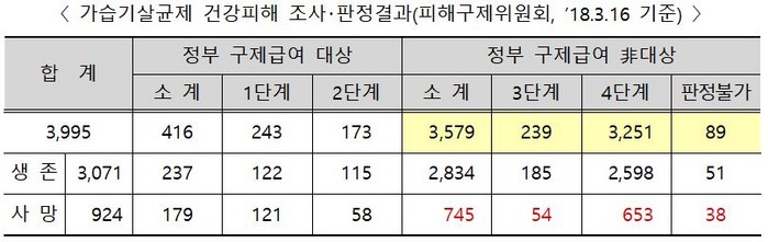 이 가운데 정부 구제급여 대상자는 1,2단계 합쳐 생존자 3071명 중 179명이 사망했고, 정부 구제급여 비대상자중 3,4단계와 판정불가자는 2834명 생존자 중 사망자는 745명으로 나타났다.