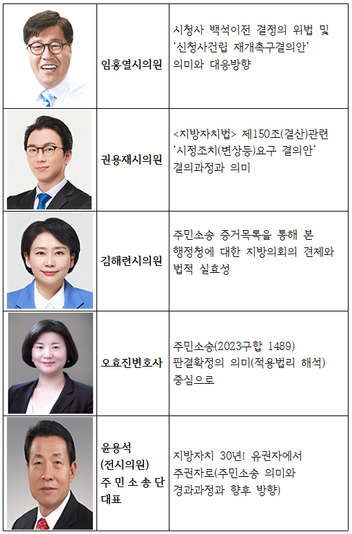 이번 토론회는 임홍열 시의원(시청사 백석이전 결정 위법과 신청사 건립 재개 촉구 결의안 발의), 권용재 시의원(자치법 제150조 적용 예비비 변상 시정요구안 결의안 결의과정 의미), 김해련 시의원(주민소송 지방의회의 견제와 법적 실효성)을 발언한다.