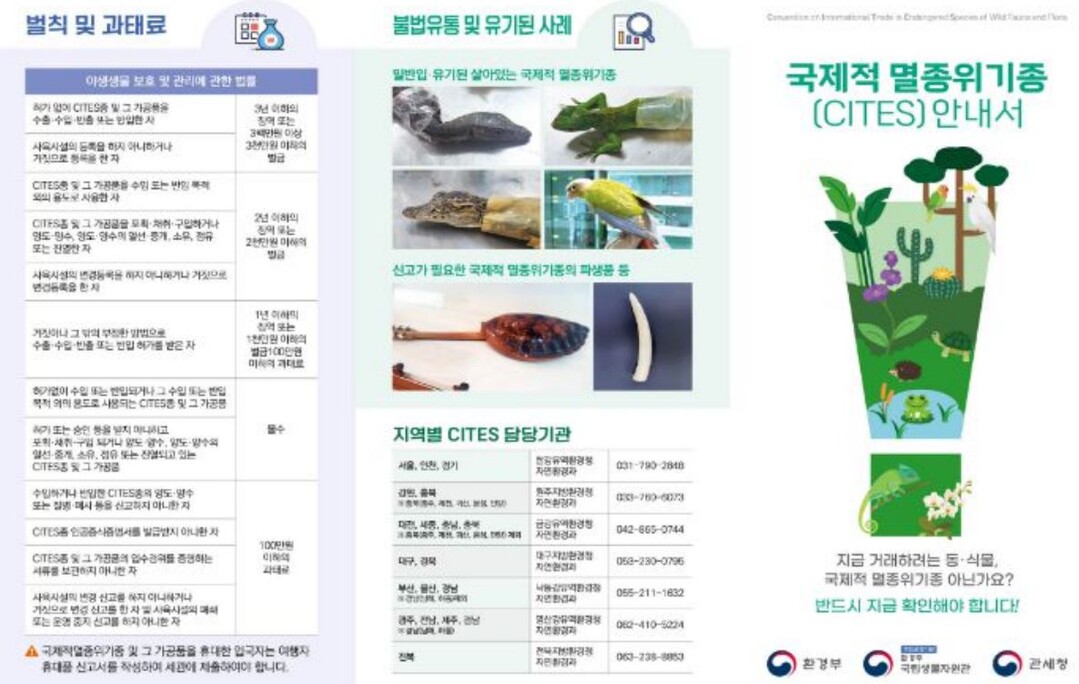 4월 4일부터 두 달간 인천공항 제1・2터미널에서 출입국자를 대상으로 국제적 멸종위기종 허가・신고 안내 방송과 홍보 영상을 송출하는 한편, 안내서를 비치해 관련 법령 및 제도의 미숙지로 인한 불법 거래 사례 등을 방지할 계획이다.