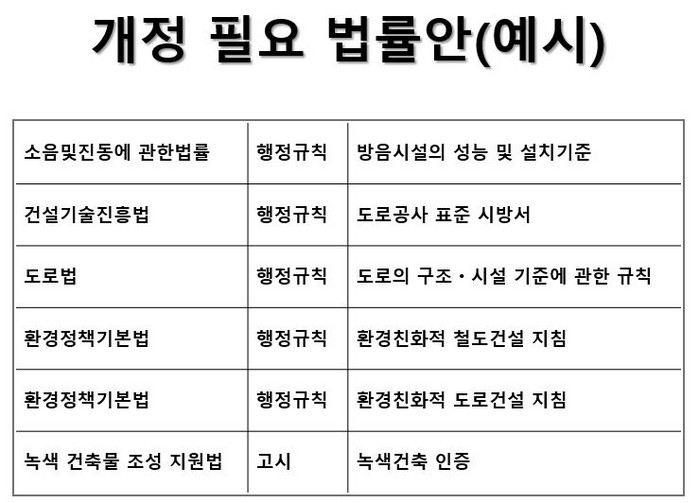 먼저 소음 및 진동에 관한법률(방음시설 성능 및 설치기준)을 손봐야 한다. 다음으로 건설기술진흥법(도로공사 표준 시방서), 도로법(도로 구조 시설 기준 관한 규칙), 환경정책기본법(환경친화적 도로건설 지침), 녹색건축물 조성 지원법(녹색건축 인증)까지 일부 법개정을 해야 비로소 새충돌을 최소화할 수 있다.