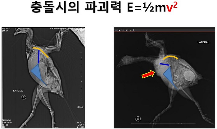 언제 물리를 마지막으로 배웠나 모르겠다. 운동에너지는 질량에 비례하며, 속도의 제곱에 비례한다. 즉 시속 10의 경우 운동에너지가 10이라면 시속 10의 경우 운동에너지가 5배 상승이 아니라 25배 상승하는 것이다. 정상적인 꿩의 방사선 측면상과 충돌 이후 나타난 측면상이다. 화살표 방향으로 운동에너지가 전달되었고 오훼골, 흉골, 척추가 다 꺾였다. 심장까지도 눌려버렸다. 우리가 여기서 볼 또 하나의 충돌의 간접적 영향은 바로 번식이다.