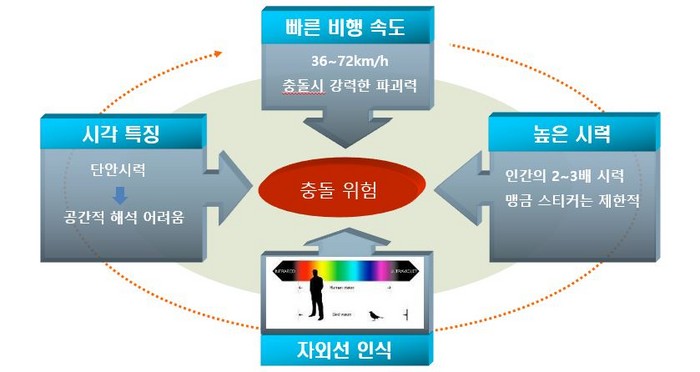 충돌 피해를 일으키는 것은 빠른 비행속도와 단안시력의 문제에서 비롯된다. 자외선 인식 영역을 이용하면 저감방안을 만들어낼 수 있는 장점이 있다. 하나씩 설명해보자. 높은 시력은 맹금류 스티커가 무의미하다는 것으로 알려준다. 천적 파악이 무척이나 전문화된 조류들은 맹금류 스티커가 뭔지 금새 알아차린다.