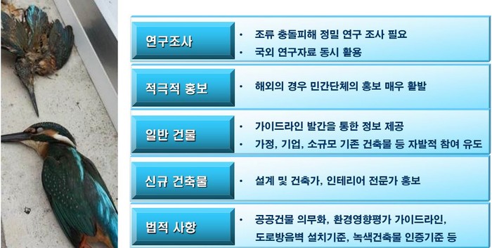 방음벽 조류 충돌방지를 위해 어떻게 바꿀 지에 대한 방법으로 법 제도 정비(상위법), 효과적 예방 및 저감방안 제시, 대국민 홍보 교육사업 전개, 시민참여형 모니터링을 통한 문제 장소 및 인식확산, 국가 성능평가 기준 마련 및 시행, 산업제품의 개발 및 우선 보급, 지자체 조례 및 도시디자인 표준에 포함돼 있다.