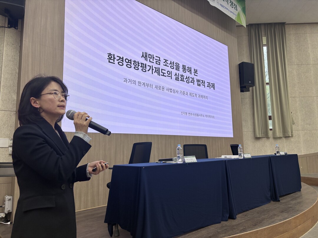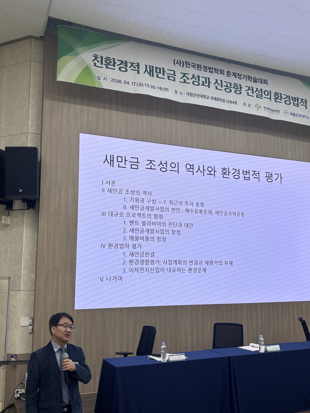 이날 학술대회는 총 2개 세션으로 '새만금 조성과 환경법'을 중심으로 진행은 정훈 전남대 교수, 발표는 채영근 인하대 법학전문대학원 교수, 신지형 법률사무소 케이제이로 변호사가 맡았다.