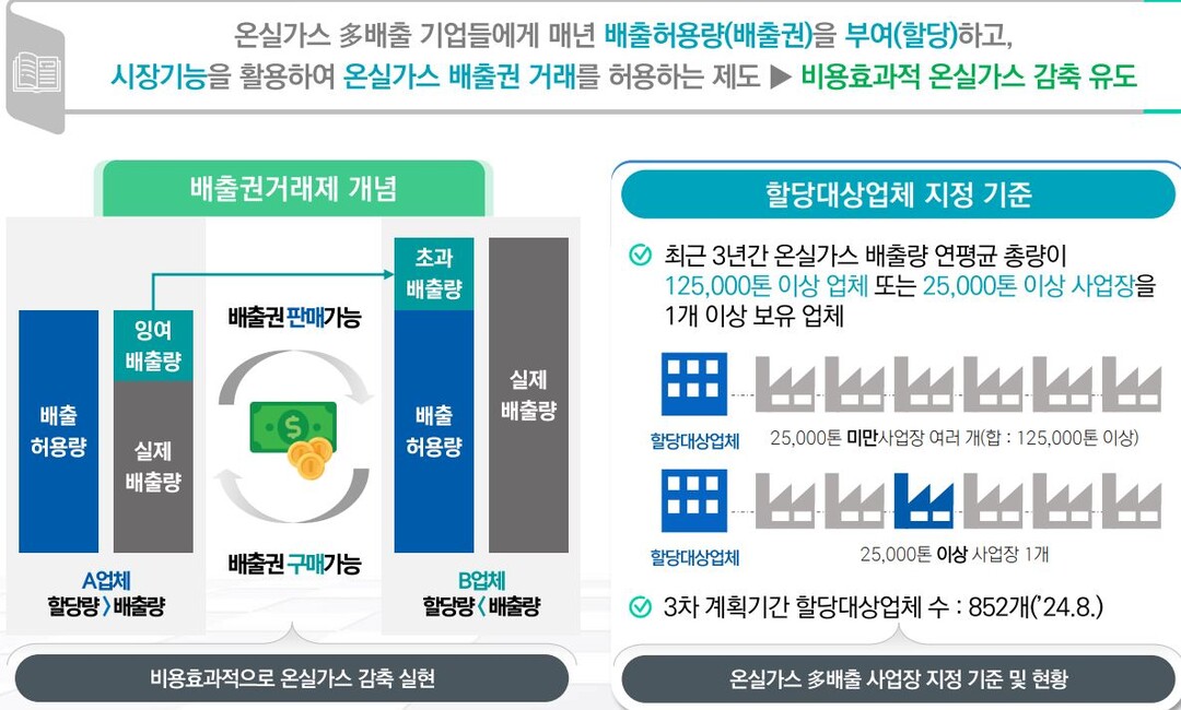 각 기업체는 할당받은 배출권의 범위 내에서 온실가스를 배출할 수 있고, 여유분 또는 부족분은 타 업체와 거래를 할 수 있다. 해당 기업은 각자의 온실가스 감축비용에 따라 직접 감축 또는 시장에서 배출권 매입을 통해 배출허용량을 준수할 수 있다.