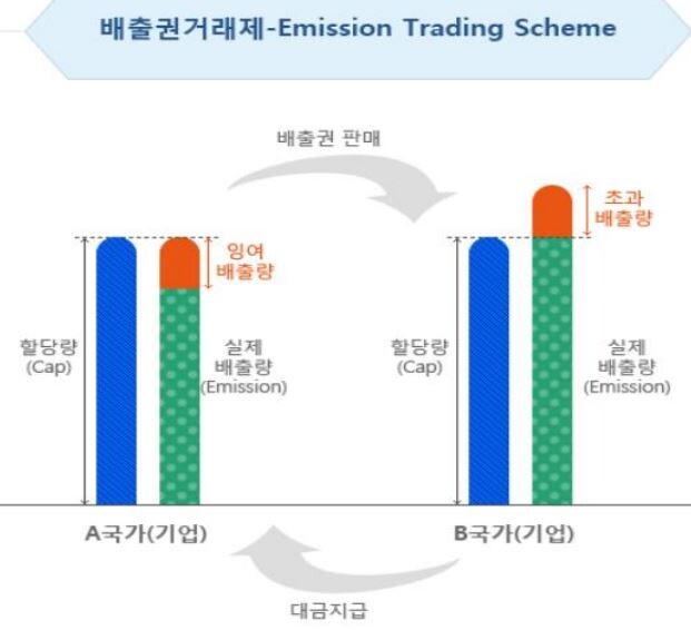 우리나라 배출권거래제 추진은 2005년 2월 교토의정서 발효를 시작으로 국가 온실가스 감축목표 설정했고 5년 뒤 녹색성장기본법 제정했다. 2012년 5월에 배출권거래법 제정하고 2년 뒤 2014년 1월에 배출권거래소 지정, 이듬해 배출권 거래시장 개시했다.