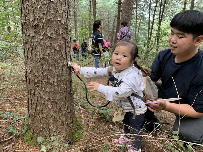 | ▲나무 속에서 물이 흐르는 소리를 들을 수 있다. 참가한 가족 중에 아이에게 청진기를 나무에 대보고 자연의 소리를 듣어보는 체험도 했다. |
