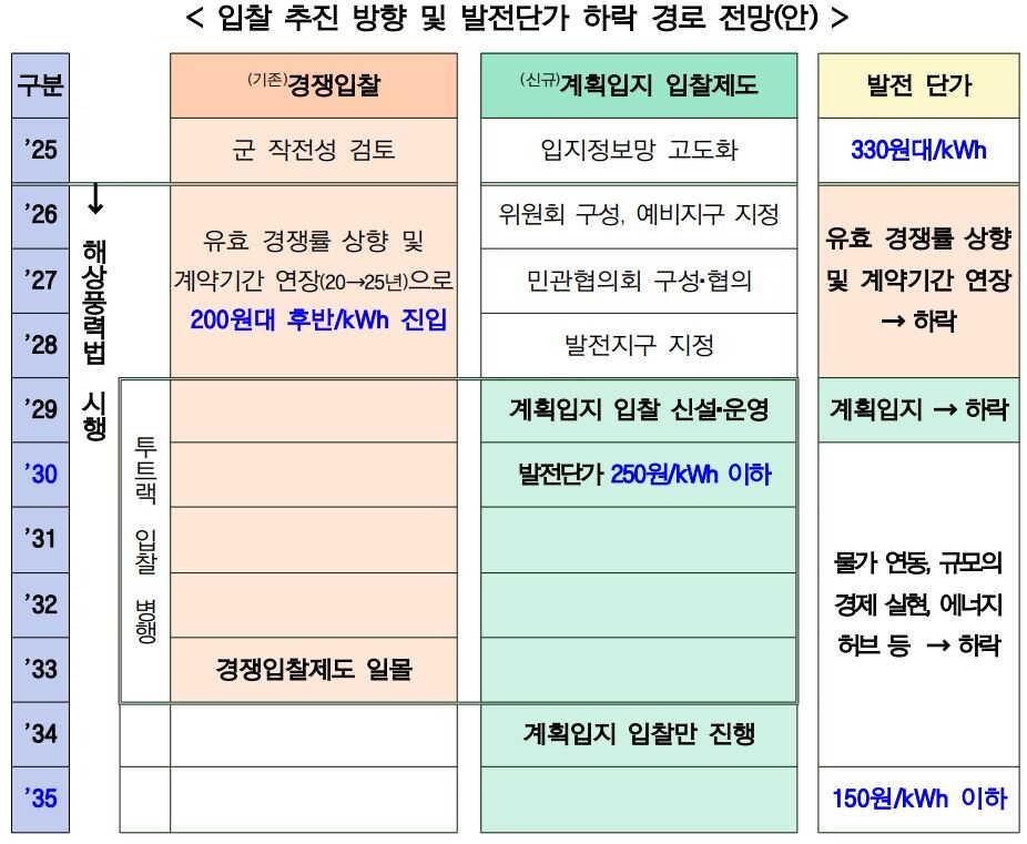중장기적으로 계약기간 연장, 물가연동 방식 등 입찰제도 개선을 검토하고 해상풍력 단지 인근에 에너지허브 구축을 통해 공용 송전망과 접속설비 중복을 해소하는 등 비용 절감을 추진한다. 보급 가속과 규모의 경제 실현을 통해 해상풍력 발전단가를 kWh당 2030년 250원 이하, 2035년 150원 이하를 목표로 낮춰갈 계획이다.