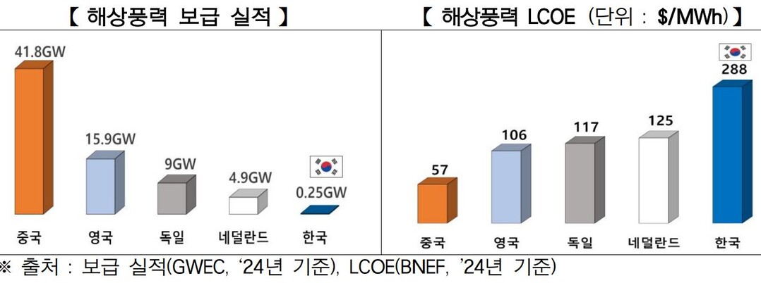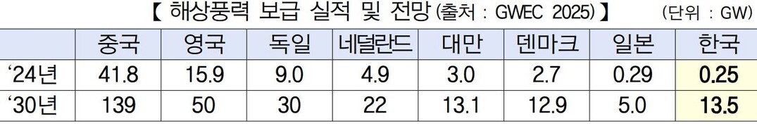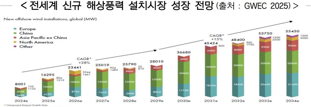 전 세계 해상풍력 시장은 2024년 83GW에서 2034년 441GW로 확대될 전망이나 국내는 해상풍력 지원 기반시설 부족, 금융 조달 애로, 복잡한 인허가, 주민 수용성 문제 등으로 해상풍력 상업운전이 연간 0.35GW 수준(2025년 기준)에 머물러 있다.
