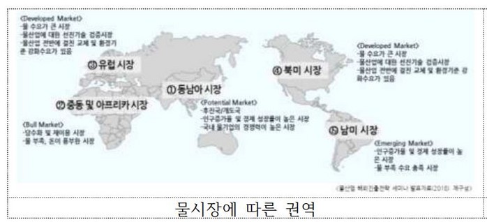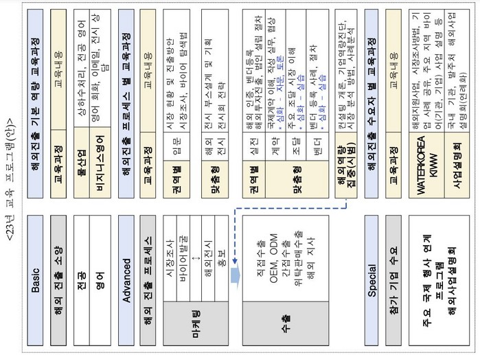 먼저 '글로벌 역량을 갖추기 위한 기초 과정'(물산업 전공 기초, 비즈니스 영어)다. 두 번째는 권역별 전문가 육성인다. 해외 권역별 동남아, 중동, 북미 파트별로 집중 교육 내용을 담고 있다.