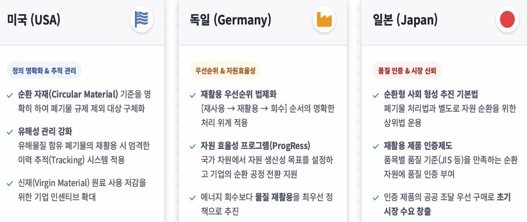 EU 폐기물 종료(End-of-Waste) 제도를 비교하면서 "OECD의 산출 기준 통계처럼 재활용량이 아닌 품질과 환경 기여도를 지표로 삼아야 한다."고 했다.