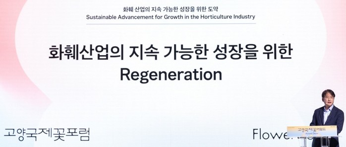 ▲이동환 고양시장은 고양국제꽃포럼에서 참석해 기조강연을 통해 화훼산업은 지구촌 온실가스 감축과 함께 생태계를 지키는데 중요한 역할을 한다고 밝혔다. |
