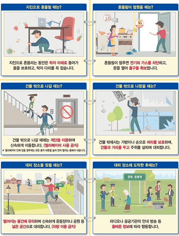 지진이 발생하면 국민 스스로 대처할 수 있도록 전국단위 국민참여 지진훈련을 연 3회 이상 실시하고, 학교안전관리사를 활용한 안전교육을 의무적으로 실시(학기당 1회)한다.
