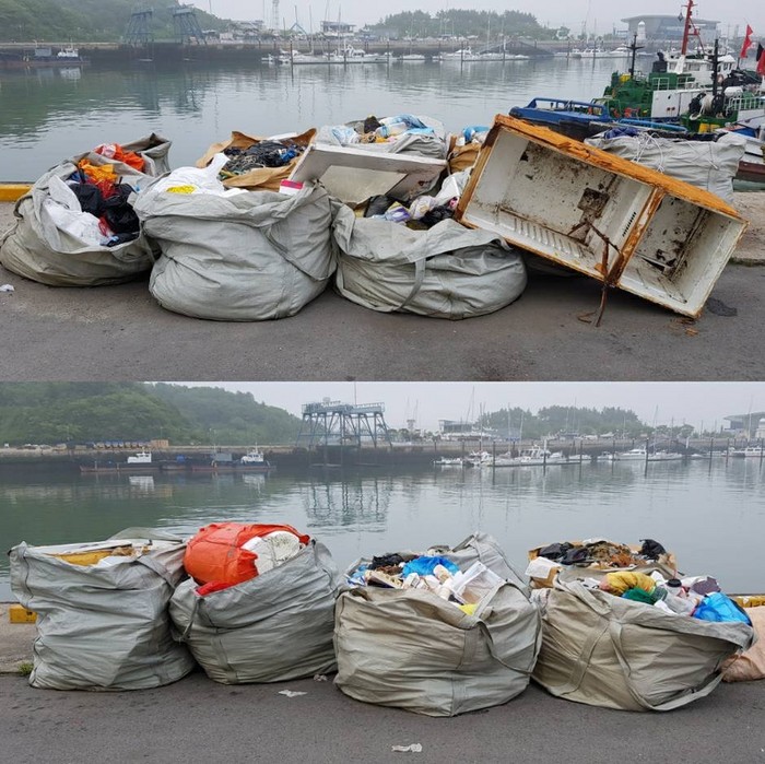 ▲바다는 여름철이 재난이자, 재앙의 시기다. 눈에 보이지 않게 막대한 양의 생활쓰레기에서부터 어선, 여객선에서 버려지는 폐 플라스틱류, 어구, 폐스트로품, 페트병 등이 바다로 흘러들어가고 있다. 그 양은 어느 정도인지 정확하지 않을 정도라고 했다. 최근 목포시는 항구쪽에서만 수거한 쓰레기만 1톤백에서 20여개를 하루동안에 수거했다. |