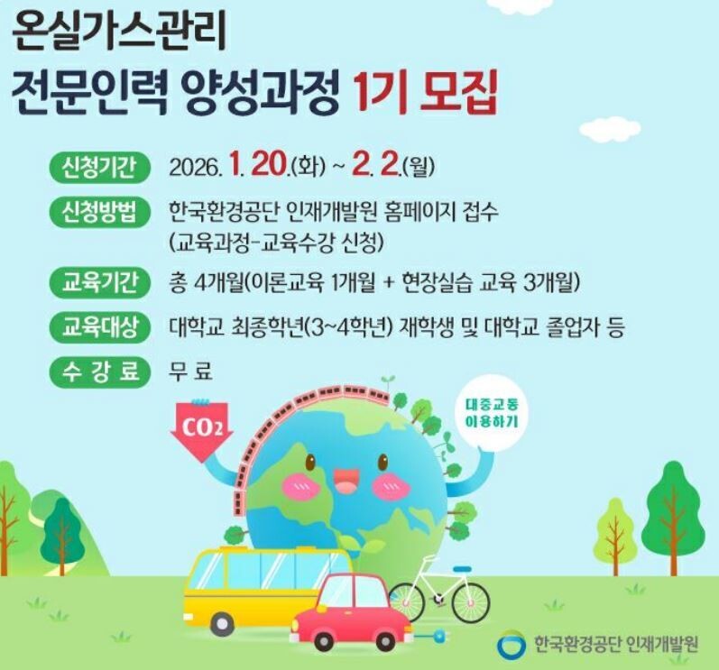 K-eco 한국환경공단(이사장 임상준)은 20일부터 다음 달 2일까지 약 2주간 2026년도 온실가스관리 전문인력 양성과정 1기 교육생을 모집한다.