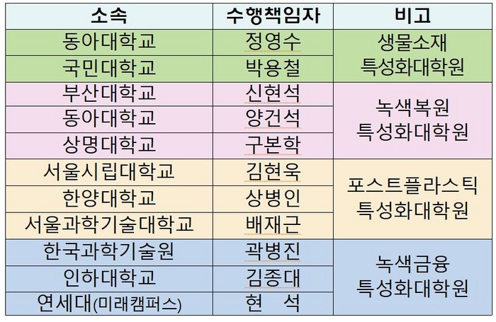 '탈 플라스틱 분야'는 서울과학기술대, 서울시립대, 한양대가, '녹색금융 분야'에서는 연세대, 인하대, 한국과학기술원이 최종 선정됐다.