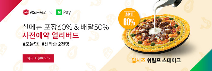 11월 2일 목요일 단 하루동안 피자헛 멤버십 가입 고객을 대상으로 '얼리버드 사전예약'을 진행해, 선착순 2000명에게 할인 쿠폰을 증정한다. 신제품 출시 이후 네이버페이로 결제해 주문할 때 해당쿠폰을 사용하면, 배달 30%할인, 포장 40%할인 혜택과 함께 네이버페이 포인트 7000원이 적립된다. 이는 포장으로 주문 했을 경우 60%에 해당하는 역대급 할인 혜택이다.
