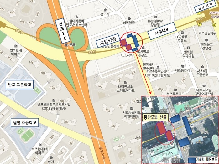 구는 사평대로 제일약품 사거리에 반포동과 서초동을 연결하는 2단 횡단보도와 교통섬을 설치해 8일 개통했다. 이곳은 반포 IC에서 사평대로로 유입되는 교통량이 증가함에 따라 2001년 서울시와 서울지방경찰청이 불가피하게 횡단보도를 없애게 됐다. 이후 주민들은 17년간 40m 거리를 가기 위해 3번 횡단보도를 건너 120m를 돌아가야 하는 불편을 겪었다. 이 지역은 신논현역 주변으로 원명초, 반포고 등 통학로와 각종 업무시설이 위치해 하루 1만여명의 보행자가 통행하는 곳이어서 주민의 불편이 더욱 컸다.
