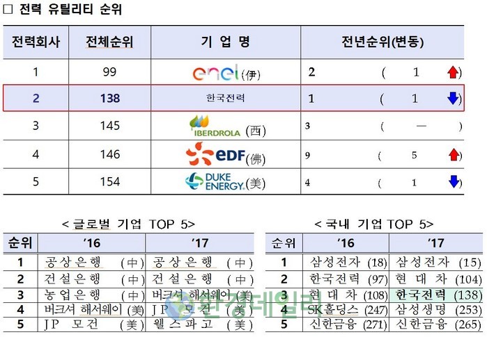[환경데일리 윤경환 기자]한국전력(사장 조환익)은 5월 25일 발표된 'Forbes 글로벌 2000 순위'에서 전력유틸리티 부문 2위, 종합 138위를 달성했다.