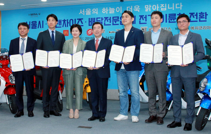 | ▲서울시청에서 열린 서울시 프랜차이즈ㆍ배달전문업체 전기 이륜차 전환 상생협약식에서 박원순 시장을 비롯한 참석자들이 협약서에 서명한 뒤 기념촬영을 하고 있다. 왼쪽부터 황학수 교촌에프앤비 총괄사장, 유지영 한국피자헛 이사, 조주연 한국맥도날드 대표, 박원순 시장, 윤현준 우아한청년들 대표, 유정범 메쉬코리아 대표, 이태권 바로고 대표] |