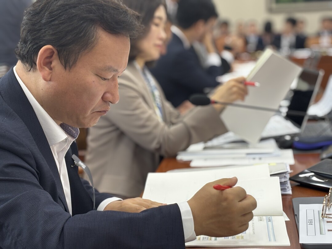 기후에너지환경부 김성환 장관(사진 중앙)이 질의에 간결하게 답변에 시선을 끌었다. 바로 옆은 산업통상자원부에서 자리를 옮겨온 이호현 제2차관이 경청하고 있다.더불어민주당 김태선 의원이 환경부 업무보고 자료집 내용중 오류가 있는 부분에 붙어 있는 종이를 떼어보고 있다.김주영 의원 기후에너지환경노동위원회 간사가 최근 경주시에 내건 한수원 현수막 사건과 내부 비리 최악의 사태에 대한 시민들의 원성을 글들을 보고 있다. 김성환 장관은 철저한 조사에 대해 대책을 종합감사까지 제출하겠다고 밝혔다.