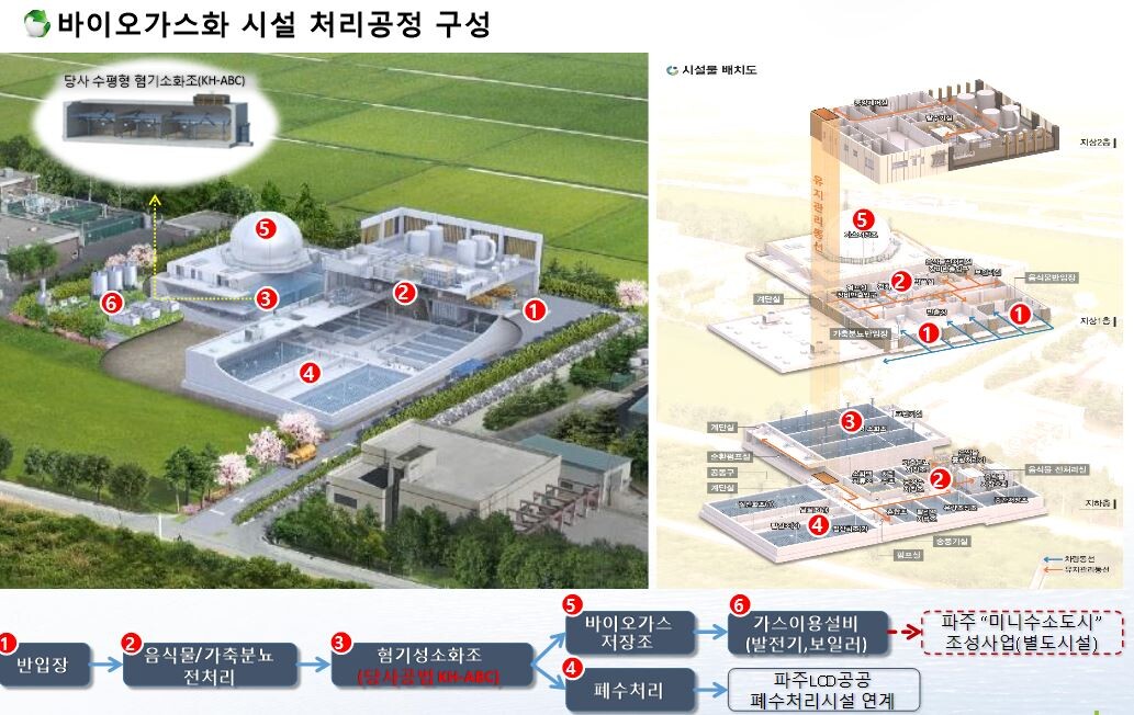 여기서 공법은 두 갈래로 나눠져 처리된다. 파주 자원순환 현대화사업의 주 목적인 바이오가스화, 폐수처리로 두 마리 토끼는 잡겠다는 설명했다. 바이오가스 저장조에서 가스이용 설비(발전기, 보일러)를 통해 파주시 최종 확정된 수소까지 공급된다.