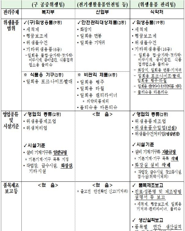 | ▲위생용품 관리법 시행 전후 안전관리체계 비교표 |
