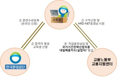 수강신청 절차는 한국환경공단 → 합격자 발표 → 워크넷(구직신청) → HRD-Net 로그인 → HRD-Net 동영상 시청 → 관할고용지원센터 방문 및 상담 → 국가기간전략산업직종 '내일배움카드(실업자)'발급받으면 된다.