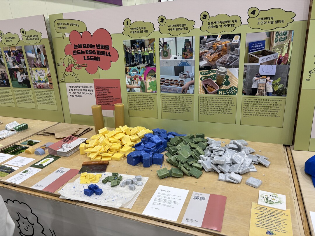 1.5도씨 1.5라이프스타일 단체는 서울시 관악구 중심으로 환경교육 프로그램을 실천하고 있다. 여러 형태의 퍼포먼스를 제공하며 지역사회에서 지구촌 온난화 문제를 해결하는데 주력했다.수녀들도 친환경 제품에 대한 관심사가 매년 ESG 친환경대전이 단골 관람객이다. 업사이클링 전문기업 주식회사 행복나무에듀는 캐릭터 샤쉐 방향제로 관람객들을 발길을 잡았다.순환경경제의 최종 마침표는 발목을 잡아온 규제다. 규제샌트박스 코너에는 기업 실무자들이 꼼꼼하게 묻고 답을 얻어갔다고 한국환경산업기술원, 한국환경공단 관계자들은 입을 오았다.유일하게 참가한 파주 문산수억고등학교 학생들은 해바라기 동호회를 구성해 평소에 자연환경 생태계 문제와 플라스틱 오염, 외래종 확산, 멸종위기종에 대한 삼각한 현상에 대한 토론과 실천 등을 꾸준히 활동해 주목을 받아왔다.캔가루 브랜드로 플라스틱 페트병 AI 자동 수거 로봇을 활용한 솔루션을 선보였다. 케이아이에코시스템(주) 대표는 AI자원수거로봇은 날로 많은 양의 플라스틱 캔 등 더 빠르고 정확하게 선별 분리작업에 용이하도록 기술력을 집중하고 있다고 소개했다.우아한형제들이 ESG가치를 위한 배달플랫폼인 '배달의 민족'으로 타이틀로 참여해 젊은 층으로부터 높은 관심을 보였다.대한민국 폐플라스틱 배출량은 2023년 기준으로 무려 1463만 톤을 넘겼다. 최근에는 청년 스타트업이 처치 곤란한 폐타이어를 활용한 업사이클링 제품 중 하나인 산업 안전화를 만들어 큰 호응은 얻고 있다. 아나키아 임희택 대표이사는 청년 CEO로 젊은 생각으로 친환경 산업의 빈틈을 노려 사업화에 정착했다. 바다 해양쓰레기가 줄지 않다. 하지만 국내 기업은 해양쓰레기를 자원화해 안전모 등 여러 산업 재난 관련 제품으로 재탄생시켜 선보였다. 현장에서 우생순 프로젝트를 설명했다. 생수병을 활용한 해양환경공단, 해양경찰청, 수협중앙회에 함께 해양폐자원을 자원으로 바꾸는데 도전하고 있다.코카콜라가 처음으로 전시부스를 마련했다. 패키징 전략은 페트병 업사이클링을 전시부스를 찾은 시민들에게 홍보했다. 쓰레기문제와 폐기물 자원을 위한 순환경제에 동참하고 있다. 페트병 알루미늄캔, 유리병 등 음료수 포장재의 회수 재활용에 대한 감축에 집중하겠다고 홍보했다. 특히 2035년까지 주요 포장재에 재활ㄹ용 소재를 35~40%까지 사용을 목표로 추진중이다. 시중에 공급된 전체 양중 최대 75%ㄲ지 회수가 목표다.국립공원공단은 탄소없는 국가공원을 위한 각양각색의 프로그램을 탐방객들에게 실천 유도하고 혜택까지 제공하고 있다. 환경부와 국립공원공단, CJ대한통운은 2028년 7월까지 공원내에서 수거해 자원하는데 협약을 맺었다. 지난해까지 약 116만개를 수거했다. 탄소조감 267톤으로 캔 1개당 탄소조감은 약 231g이다. 그뿐만이 아니다. 국립공원공단은 무공해 영지를 실행하기 위한 무공해 전용 공원시설 확대로 주력하고 있다.친환경이 아니면 명함도 내밀 수 없는 세상이 됐다. 친환경 장갑은 가정용 산업용으로 구분해 불티나게 팔리는 추세다. 이 회사는 세계 최초 친환경 장갑으로 선풍적인 인기를 끌었다. 발암성 독성물질이 없는 것이 장갑의 특성이다. 국내 시중신용카드사는 한국환경산업기술원과 함께 카본 페이를 선보이면 쓰는 만큼 탄소저감이 가능한 녹색제품 친환경 녹색인증 구매를 유도하고 있다.한국환경산업협회는 새활용 정책으로 정부 공공기관 기업을 대상으로 확산에 주력하고 있다. (사진 왼쪽부터) 케이앤엘팩 임재원 대표이사, K-eco 임상준 이사장, 케이앤엘팩 곽경선 수석팀장, 환경부 금한승 차관, 한국순환자원유통지원센터 이명환 이사장, KEITI 김영기 원장 직무 대행, 환경부 기대철 과장이 친환경 포장재 제품설명을 듣고 있다. 이 회사는 교촌치킨 자회사로 종이포장재만 생산 보급하고 있다.