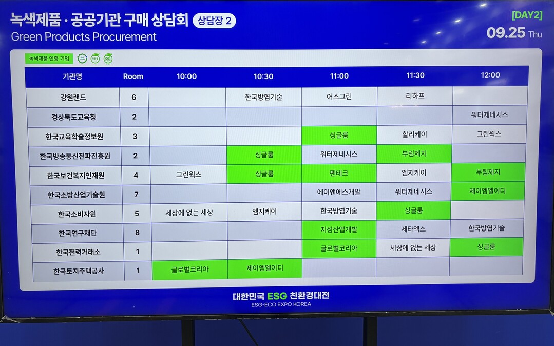 2026년도 조달 녹색제품 우선 구매 담당 화학, 자동차, 식품업계, 공공기관 등 관계자들은 판촉물에서부터 사내에 소모품까지 환경표지인증, 녹색인증 친환경 마크가 아니면 제외되기 때문에 녹색제품 트랜드를 물색하기 위해 꼼꼼하게 부스를 둘려봤다."고 발길을 돌렸다.